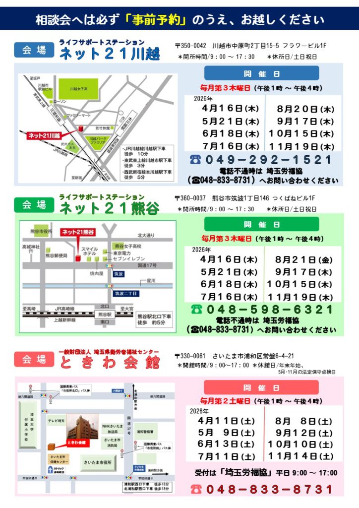 一社)埼玉労福協では、埼玉県内に居住、または通勤している勤労者のために川越市・熊谷市・さいたま市浦和区の3ヶ所で、毎月「無料法律相談会」を開催しています。