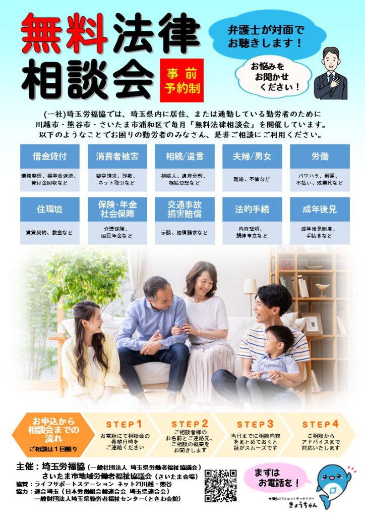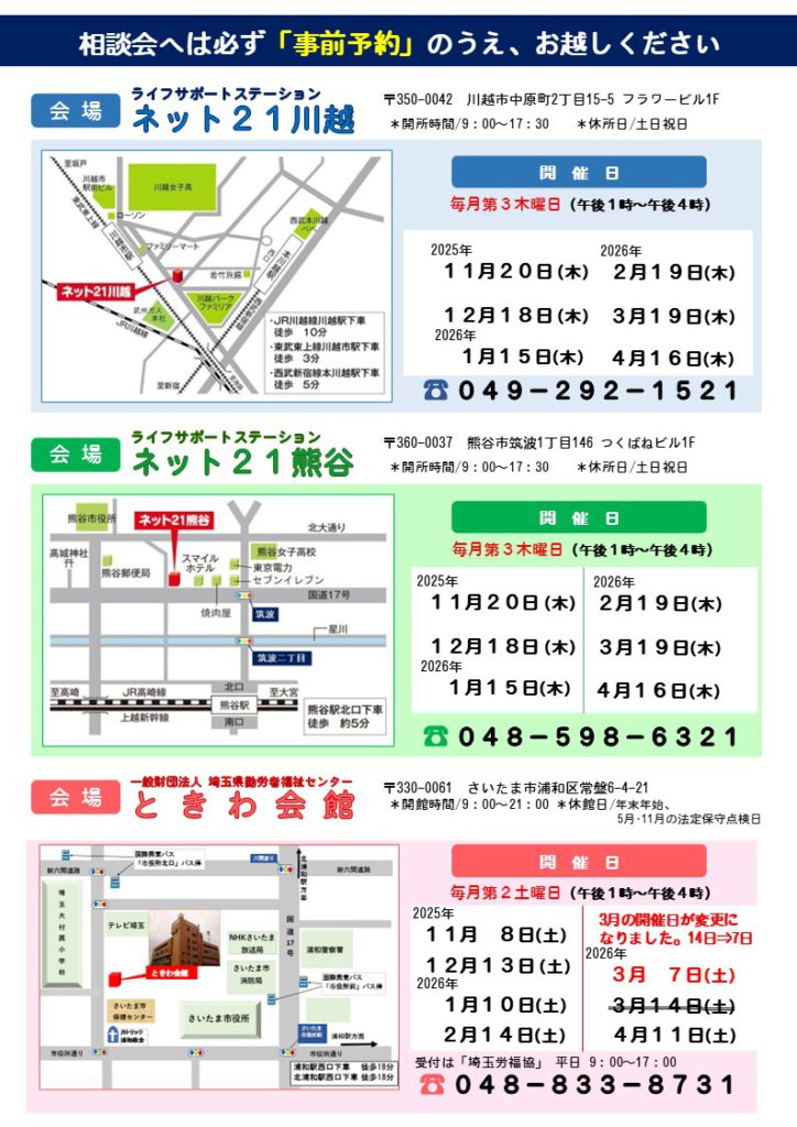 お知らせ無料法律相談会開催日変更のお知らせ(浦和会場 3月分) 報告日:2026.01.10 県内在住・在勤の方を対象に毎月開催している「弁護士による無料法律相談会」について、都合により浦和会場開催分の2026年3月分について開催日が変更となります。 当初開催予定日 :2026年3月14日(土) 変更後開催予定日 :2026年3月7日(土)
